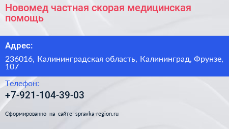 Новомед, частная скорая медицинская помощь по адресу 236016, Калининградская область, Калининград, Фрунзе, 107 в дальнейшем Организация, размещена в следующих категориях: