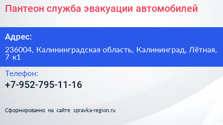 Пантеон, служба эвакуации автомобилей по адресу 236004, Калининградская область, Калининград, Лётная, 7 к1 в дальнейшем Организация, размещена в следующих категориях: