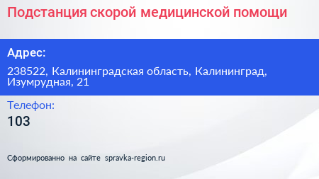 Подстанция скорой медицинской помощи по адресу 238522, Калининградская область, Калининград, Изумрудная, 21 в дальнейшем Организация, размещена в следующих категориях: