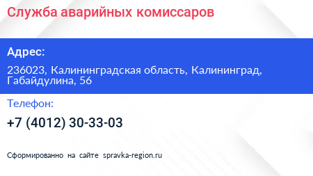 Служба аварийных комиссаров по адресу 236023, Калининградская область, Калининград, Габайдулина, 56 в дальнейшем Организация, размещена в следующих категориях: