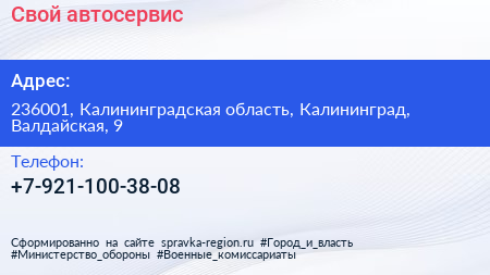Свой автосервис по адресу 236001, Калининградская область, Калининград, Валдайская, 9 в дальнейшем Организация, размещена в следующих категориях:
