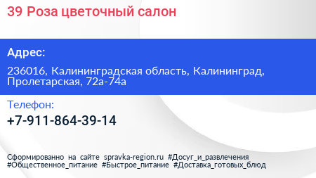 39 Роза, цветочный салон по адресу 236016, Калининградская область, Калининград, Пролетарская, 72а-74а в дальнейшем Организация, размещена в следующих категориях: