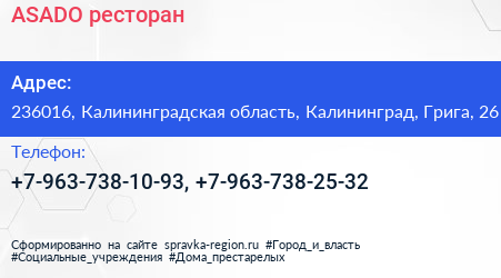 ASADO, ресторан по адресу 236016, Калининградская область, Калининград, Грига, 26 в дальнейшем Организация, размещена в следующих категориях:
