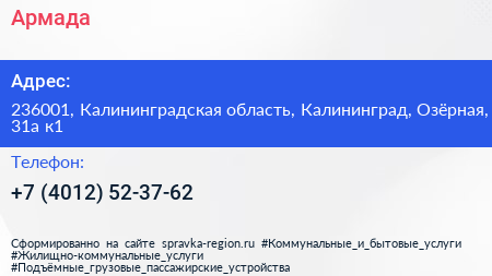 Армада по адресу 236001, Калининградская область, Калининград, Озёрная, 31а к1 в дальнейшем Организация, размещена в следующих категориях: