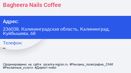 Bagheera Nails Coffee по адресу 236038, Калининградская область, Калининград, Куйбышева, 68 в дальнейшем Организация, размещена в следующих категориях: