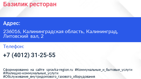 Базилик, ресторан по адресу 236016, Калининградская область, Калининград, Литовский вал, 2 в дальнейшем Организация, размещена в следующих категориях: