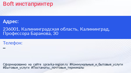Boft, инстапринтер по адресу 236001, Калининградская область, Калининград, Профессора Баранова, 30 в дальнейшем Организация, размещена в следующих категориях: