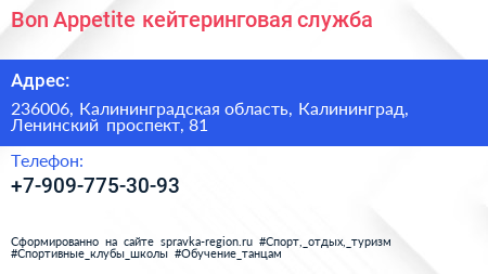 Bon Appetite, кейтеринговая служба по адресу 236006, Калининградская область, Калининград, Ленинский проспект, 81 в дальнейшем Организация, размещена в следующих категориях: