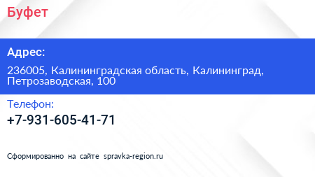 Буфет по адресу 236005, Калининградская область, Калининград, Петрозаводская, 100 в дальнейшем Организация, размещена в следующих категориях: