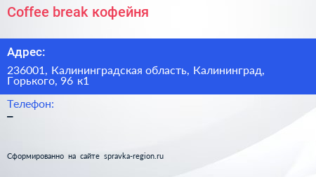 Coffee break, кофейня по адресу 236001, Калининградская область, Калининград, Горького, 96 к1 в дальнейшем Организация, размещена в следующих категориях: