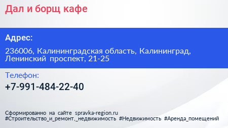 Дал и борщ, кафе по адресу 236006, Калининградская область, Калининград, Ленинский проспект, 21-25 в дальнейшем Организация, размещена в следующих категориях: