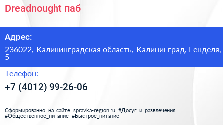 Dreadnought, паб по адресу 236022, Калининградская область, Калининград, Генделя, 5 в дальнейшем Организация, размещена в следующих категориях: