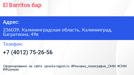 El Barritos, бар по адресу 236039, Калининградская область, Калининград, Багратиона, 49в в дальнейшем Организация, размещена в следующих категориях: