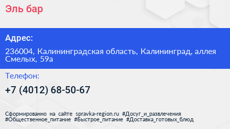 Эль, бар по адресу 236004, Калининградская область, Калининград, аллея Смелых, 59а в дальнейшем Организация, размещена в следующих категориях: