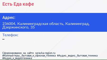 Есть Еда, кафе по адресу 236004, Калининградская область, Калининград, Дзержинского, 35 в дальнейшем Организация, размещена в следующих категориях: