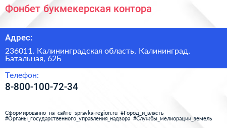 Фонбет, букмекерская контора по адресу 236011, Калининградская область, Калининград, Батальная, 62Б в дальнейшем Организация, размещена в следующих категориях:
