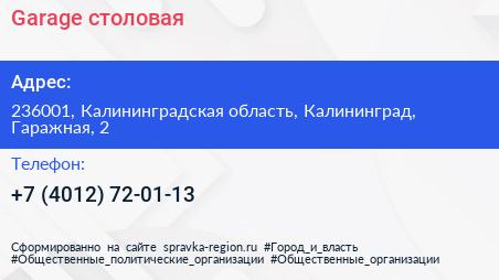 Garage, столовая по адресу 236001, Калининградская область, Калининград, Гаражная, 2 в дальнейшем Организация, размещена в следующих категориях: