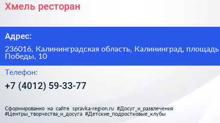 Хмель, ресторан по адресу 236016, Калининградская область, Калининград, площадь Победы, 10 в дальнейшем Организация, размещена в следующих категориях: