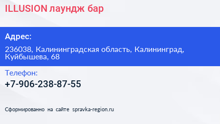 ILLUSION, лаундж-бар по адресу 236038, Калининградская область, Калининград, Куйбышева, 68 в дальнейшем Организация, размещена в следующих категориях: