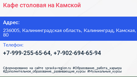 Кафе-столовая на Камской по адресу 236005, Калининградская область, Калининград, Камская, 80 в дальнейшем Организация, размещена в следующих категориях: