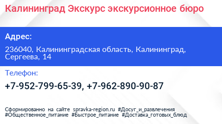 Калининград Экскурс, экскурсионное бюро по адресу 236040, Калининградская область, Калининград, Сергеева, 14 в дальнейшем Организация, размещена в следующих категориях:
