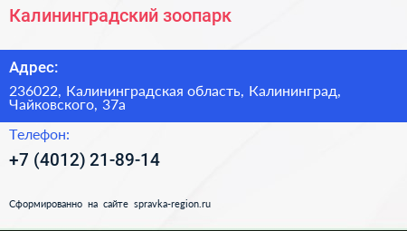 Калининградский зоопарк по адресу 236022, Калининградская область, Калининград, Чайковского, 37а в дальнейшем Организация, размещена в следующих категориях: