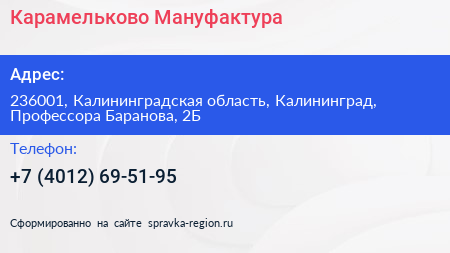 Карамельково Мануфактура по адресу 236001, Калининградская область, Калининград, Профессора Баранова, 2Б в дальнейшем Организация, размещена в следующих категориях: