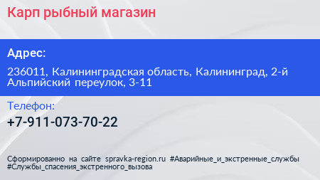 Карп, рыбный магазин по адресу 236011, Калининградская область, Калининград, 2-й Альпийский переулок, 3-11 в дальнейшем Организация, размещена в следующих категориях: