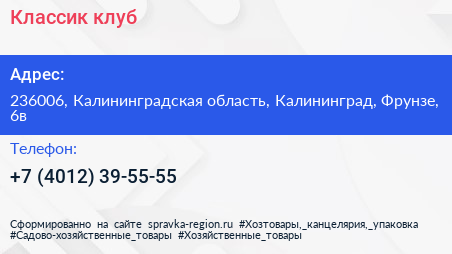 Классик, клуб по адресу 236006, Калининградская область, Калининград, Фрунзе, 6в в дальнейшем Организация, размещена в следующих категориях:
