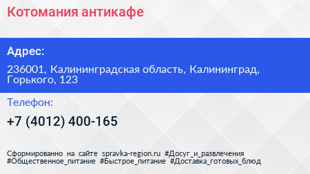 Котомания, антикафе по адресу 236001, Калининградская область, Калининград, Горького, 123 в дальнейшем Организация, размещена в следующих категориях: