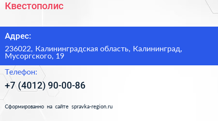 Квестополис по адресу 236022, Калининградская область, Калининград, Мусоргского, 19 в дальнейшем Организация, размещена в следующих категориях: