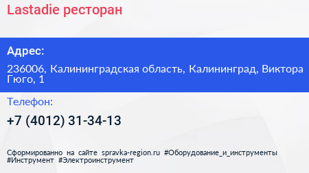Lastadie, ресторан по адресу 236006, Калининградская область, Калининград, Виктора Гюго, 1 в дальнейшем Организация, размещена в следующих категориях: