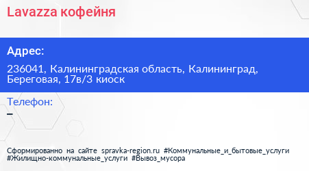 Lavazza, кофейня по адресу 236041, Калининградская область, Калининград, Береговая, 17в/3 киоск в дальнейшем Организация, размещена в следующих категориях: