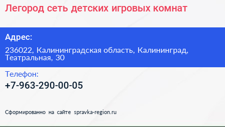 Легород, сеть детских игровых комнат по адресу 236022, Калининградская область, Калининград, Театральная, 30 в дальнейшем Организация, размещена в следующих категориях: