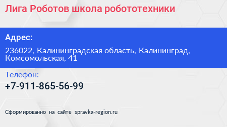 Лига Роботов, школа робототехники по адресу 236022, Калининградская область, Калининград, Комсомольская, 41 в дальнейшем Организация, размещена в следующих категориях: