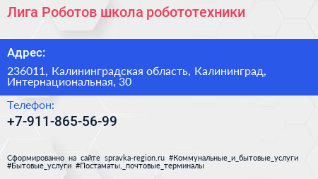 Лига Роботов, школа робототехники по адресу 236011, Калининградская область, Калининград, Интернациональная, 30 в дальнейшем Организация, размещена в следующих категориях: