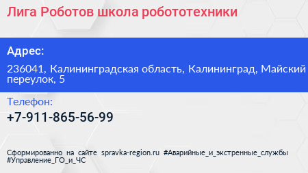 Лига Роботов, школа робототехники по адресу 236041, Калининградская область, Калининград, Майский переулок, 5 в дальнейшем Организация, размещена в следующих категориях: