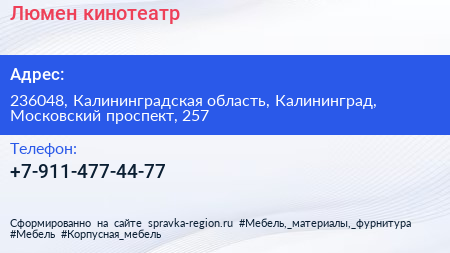 Люмен, кинотеатр по адресу 236048, Калининградская область, Калининград, Московский проспект, 257 в дальнейшем Организация, размещена в следующих категориях: