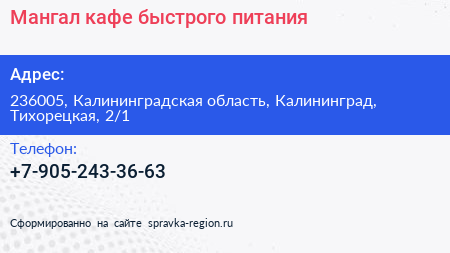 Мангал, кафе быстрого питания по адресу 236005, Калининградская область, Калининград, Тихорецкая, 2/1 в дальнейшем Организация, размещена в следующих категориях: