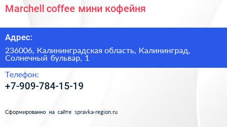 Marchell coffee, мини-кофейня по адресу 236006, Калининградская область, Калининград, Солнечный бульвар, 1 в дальнейшем Организация, размещена в следующих категориях: