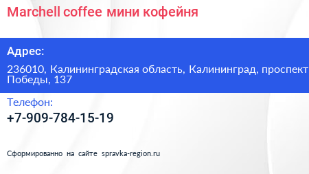 Marchell coffee, мини-кофейня по адресу 236010, Калининградская область, Калининград, проспект Победы, 137 в дальнейшем Организация, размещена в следующих категориях: