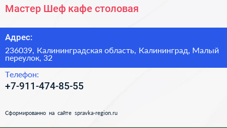 Мастер-Шеф, кафе-столовая по адресу 236039, Калининградская область, Калининград, Малый переулок, 32 в дальнейшем Организация, размещена в следующих категориях: