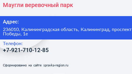 Маугли, веревочный парк по адресу 236010, Калининградская область, Калининград, проспект Победы, 1е в дальнейшем Организация, размещена в следующих категориях: