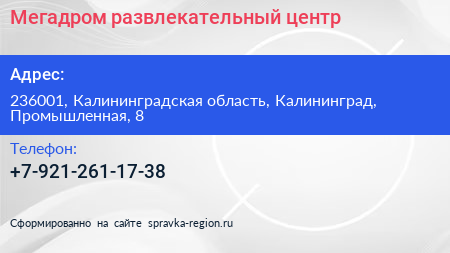 Мегадром, развлекательный центр по адресу 236001, Калининградская область, Калининград, Промышленная, 8 в дальнейшем Организация, размещена в следующих категориях: