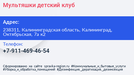 Мультяшки, детский клуб по адресу 238311, Калининградская область, Калининград, Октябрьская, 7а к2 в дальнейшем Организация, размещена в следующих категориях: