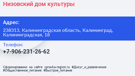 Низовский дом культуры по адресу 238313, Калининградская область, Калининград, Калининградская, 18 в дальнейшем Организация, размещена в следующих категориях: