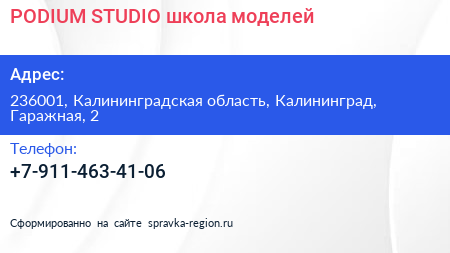 PODIUM STUDIO, школа моделей по адресу 236001, Калининградская область, Калининград, Гаражная, 2 в дальнейшем Организация, размещена в следующих категориях: