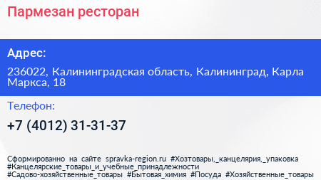 Пармезан, ресторан по адресу 236022, Калининградская область, Калининград, Карла Маркса, 18 в дальнейшем Организация, размещена в следующих категориях: