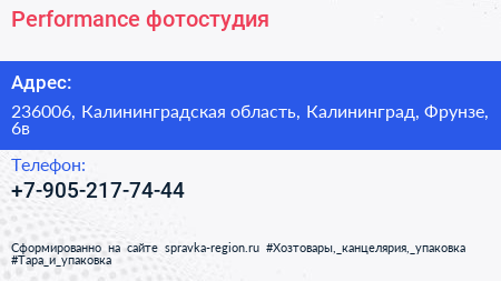 Performance, фотостудия по адресу 236006, Калининградская область, Калининград, Фрунзе, 6в в дальнейшем Организация, размещена в следующих категориях: