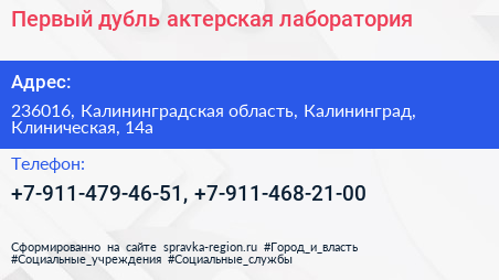 Первый дубль, актерская лаборатория по адресу 236016, Калининградская область, Калининград, Клиническая, 14а в дальнейшем Организация, размещена в следующих категориях: